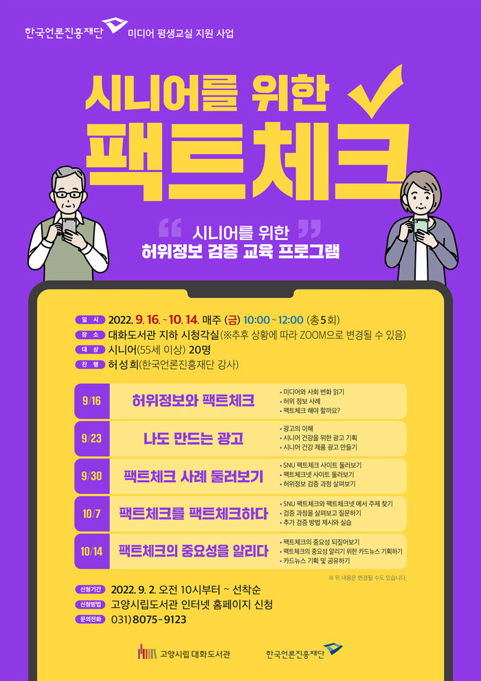 9월 16일(금)부터 10월 14일(금)까지 진행할 이번 프로그램은 각종 광고 및 기사 등의 허위 정보를 구별해낼 수 있는 능력을 함양할 수 있도록 시니어(55세 이상)를 대상으로 오전 10시부터 12시까지 진행할 예정이다.