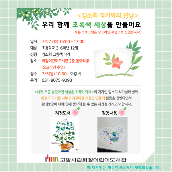[부자동네타임즈 김인수기자] 고양시 화정어린이도서관은 COP28(제28차 유엔기후변화협약 당사국총회) 유치 추진에 맞춰 환경에 대한 어린이들의 관심을 유도하기 위해 7월 27일‘우리 함께 초록색 세상을 만들어요’를 운영한다.