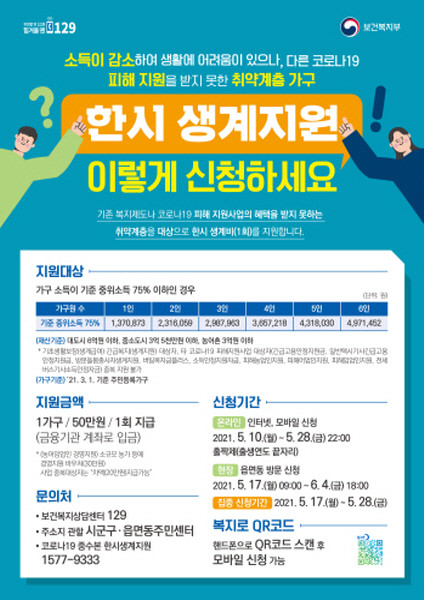 ‘한시 생계지원금’은 코로나19 장기화로 소득이 감소했지만 지급 대상이 아니어서 4차 재난지원금 등 정부 지원금을 받지 못한 위기가구를 대상으로 가구원 수와 상관없이 생계지원금 50만원을 1회 한시적으로 지급하는 사업이다. 농·어·임업인 소규모 농가 등을 대상으로 한 경영지원 바우처(30만원) 지원 대상은 차액 20만원을 받는다.