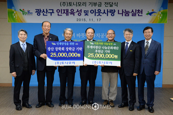 이날 광산구청 2층 회의실에서 가진 간략한 기탁식에는 배해동 토니모리 회장, 김동철 구회의원, 류경선 어등회장, 김종원 전남정책개발원장, 강박원 광산장학회 이사장, 강위원 투게더광산 나눔문화재단 상임이사, 민형배 광산구청장이 함께했다.