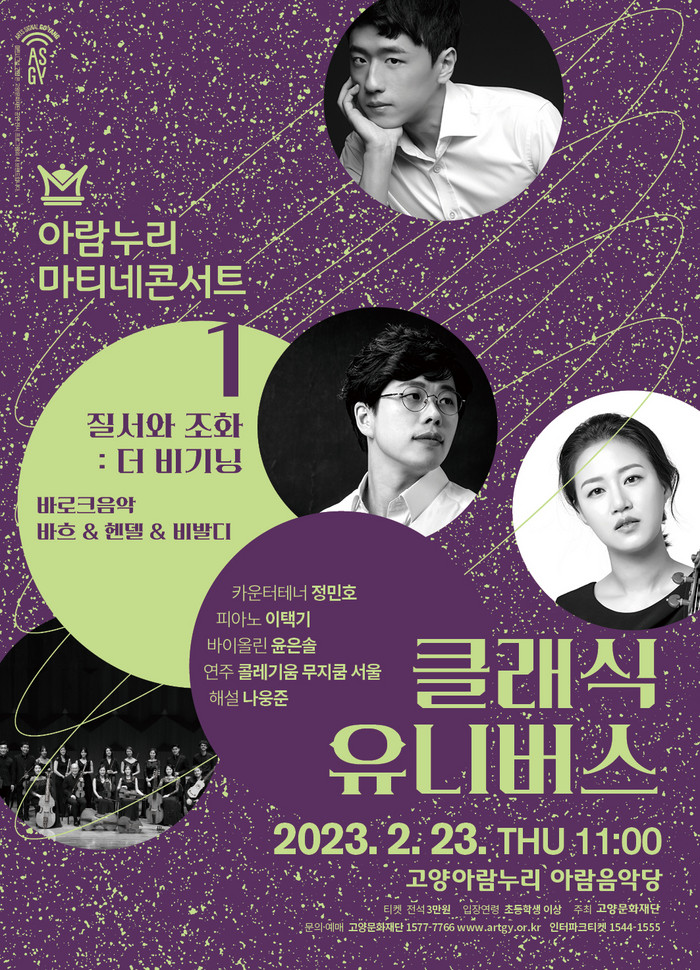 [부자동네타임즈 김인수기자] 고양문화재단은 2023년 고양아람누리 마티네콘서트의 새로운 시리즈 첫 공연으로 <클래식 유니버스 1 질서와 조화 : 더 비기닝>을 2월 23일(목), 고양아람누리 아람음악당에서 선보인다. 올해 새롭게 선보이는 <클래식 유니버스> 시리즈는 클래식 음악의 계보와 지형도에 접근하고자 하는 초심자들을 대상으로 주제별, 작곡가별 명곡을 엄선한 평일 오전 프로그램이다.