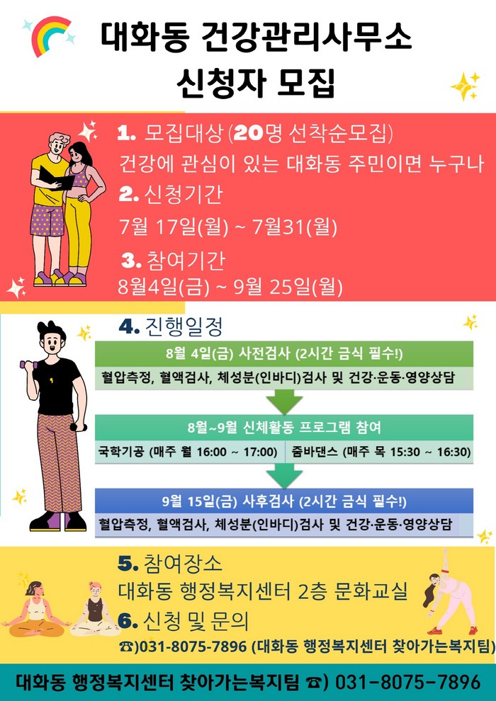 [부자동네타임즈 김인수기자] 고양특례시 대화동 행정복지센터는 주민들의 건강관리를 위해‘대화동 건강관리사무소’의 신청자를 7월 17일부터 31일까지 선착순 20명 모집한다고 밝혔다.