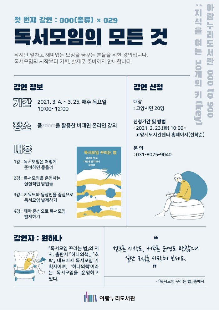 ‘독서 모임의 모든 것’ 프로그램과 관련된 추가적인 정보 및 독서 모임에 대한 문의는 고양시 아람누리도서관으로 하면 된다.
