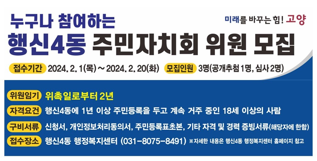 [부자동네타임즈 = 김인수 기자] 고양특례시 덕양구 행신4동이 지난 1일부터 20일까지 주민자치회 위원을 공개 모집한다고 밝혔다.
