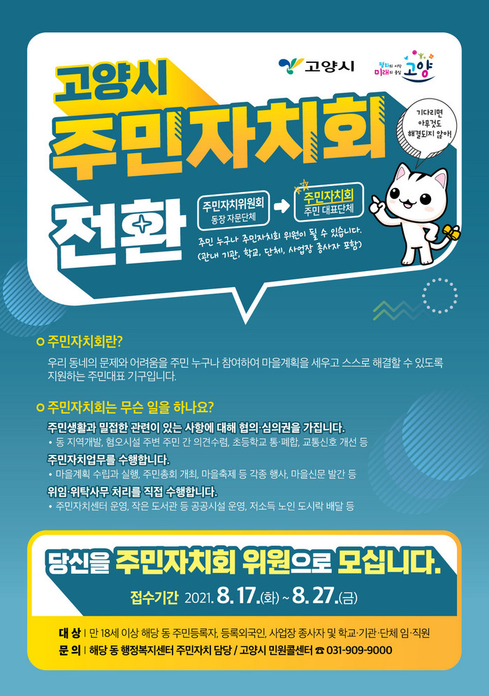 시 관계자는 “주민자치회 전면 전환을 통해 한 단계 진전된 주민자치 시대가 열리게 됐다”며 “더 좋은 고양을 만들기 위해 시민 여러분이 관심을 가지고 참여해주시기를 부탁드린다”고 말했다.