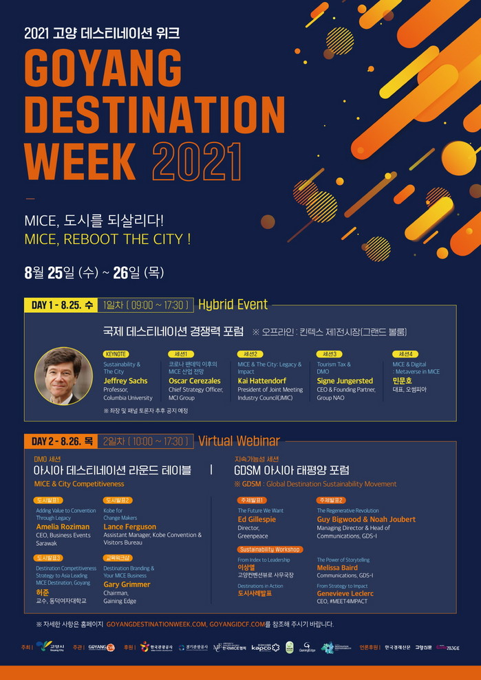 행사에는 국내외 MICE분야 석학 및 전문가들이 연사 및 토론자로 참여한다. 특히 첫날 기조강연은 지속가능개발 분야의 세계적 전문가인 Jeffrey Sachs (美)콜롬비아대 교수가 ‘지속가능성과 도시’를 주제로 발표한다. 이어 (전)UN사무차장 김원수 대사의 진행으로 김철원 경희대학교 교수가 함께하는 특별대담을 한다.