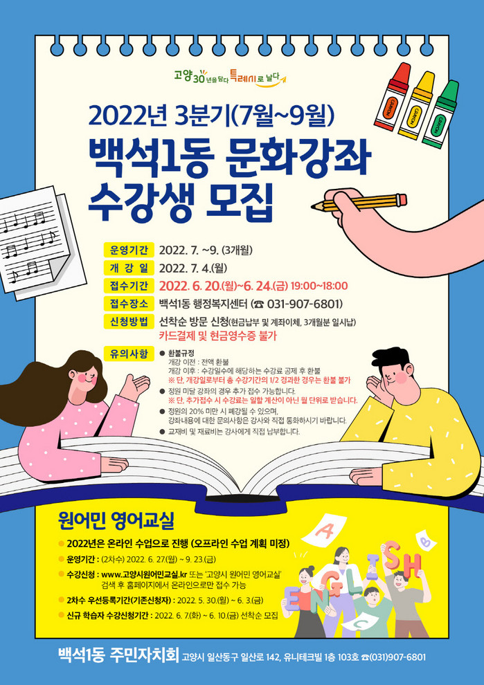 [부자동네타임즈 김인수기자] 고양시 일산동구 백석1동 주민자치회(회장 이석구)는 7월 문화강좌가 재개됨에 따라 6월 20일부터 6월 24일까지 3분기(7월~9월) 수강희망자를 모집한다고 밝혔다.