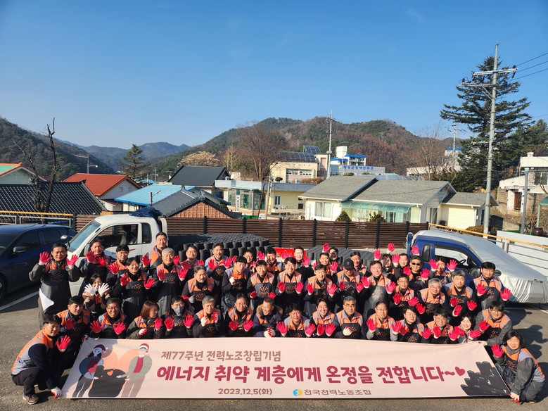 한국전력공사(대표이사 사장 김동철)의 전국전력노동조합(위원장 최철호)은 지난 12월 5일 강원도 횡성에서 제77차 노조창립기념일을 맞이하여 겨울철 어려움을 겪는 에너지 취약계층을 위해 연탄 6,000여장 기부하고 연탄나눔 봉사활동을 시행하였다.