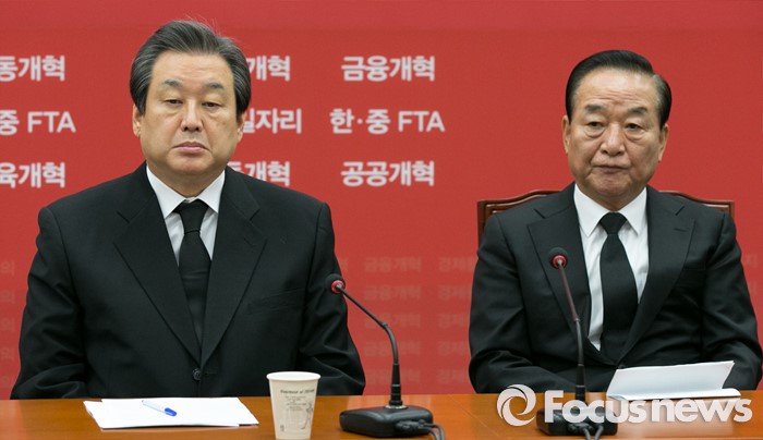 | △ 26일 오전 서울 여의도 국회에서 열린 새누리당 최고위원회의에 김무성(왼쪽) 대표와 서청원 최고위원이 함께 앉아 있다. <사진제공=포커스뉴스> |
