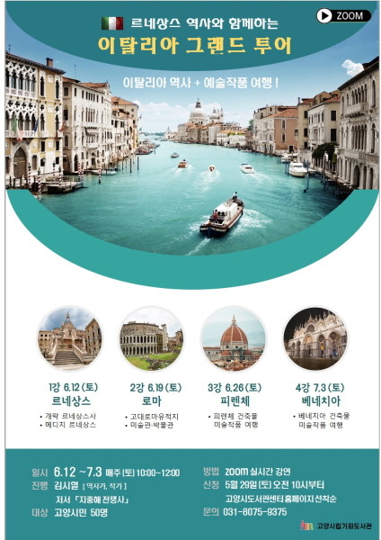 [부자동네타임즈 김인수기자] 고양시 가좌도서관은 오는 6월 12일부터 7월 3일까지 매주 토요일마다 ‘르네상스 역사와 함께하는 이탈리아 그랜드 투어’ 문화예술 프로그램을 운영한다.