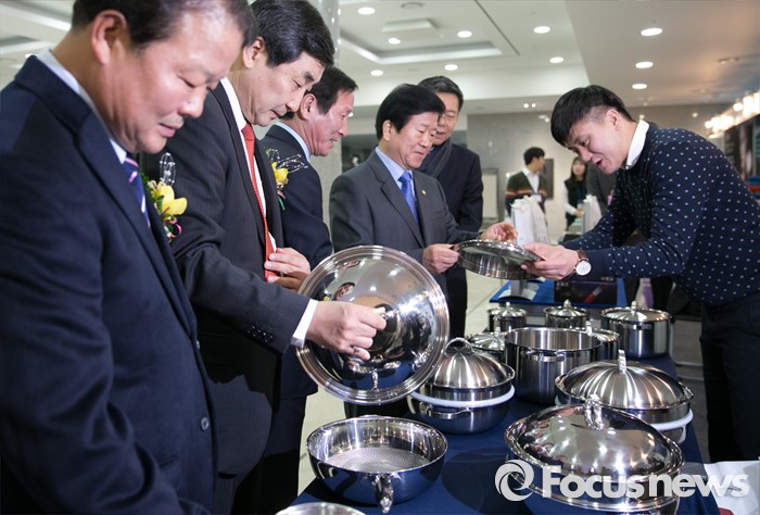 (서울=포커스뉴스) 7일 오전 서울 여의도 국회 의원회관에서 열린 2015 개성공단 우리기업 상품 전시회에 참석한 이종걸(왼쪽 두번째부터) 새정치민주연합 원내대표, 정기섭 개성공단기업협회장, 박병석 의원, 최재천 정책위의장 등 내빈들이 상품을 살펴보고 있다.