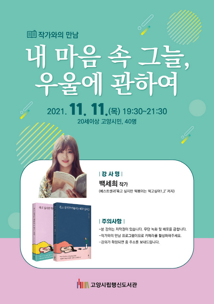 [부자동네타임즈 김인수기자] 고양시 행신도서관이 우울증 에세이 죽고 싶지만 떡볶이는 먹고 싶어의 저자 백세희 작가와 함께하는 ‘내 마음 속 그늘, 우울에 관하여’ 프로그램을 11월 11일(목) 개최한다.