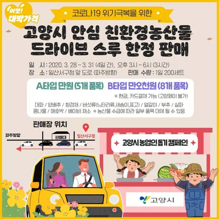 [부자동네타임즈 김인수기자] 고양시(시장 이재준)는 28일부터 31일까지 4일간 일산서구청 앞 파주방향 도로변에서 친환경 농산물을 판매하는 ‘드라이브 스루 안심판매장’을 개장한다.