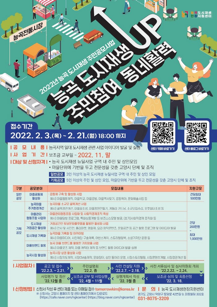 신청자격은 능곡 도시재생 뉴딜사업 구역 거주자 또는 생활권자 그리고 고양시에 기반을 둔 단체 등으로 사업대상지역과 공모 유형에 따라 다르다. 신청서 작성 후 2월 21일까지 능곡 도시재생현장지원센터(이하 센터)를 방문 접수하거나 이메일로 제출하면 된다.