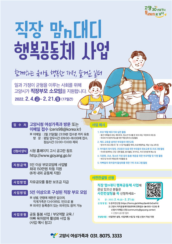 [부자동네타임즈 김인수기자] 고양시는 부모가 함께하는 양육 환경을 조성하고 일과 가정이 양립하는 성평등한 사회를 구현하기 위한 ‘2022 직장맘n대디 행복공동체 사업’을 공모한다고 4일 밝혔다.