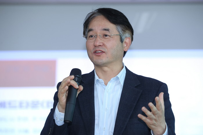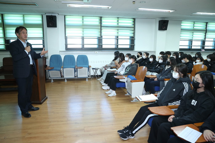 [사진설명] 이동환 고양시장이 저동고등학교에서 ‘고양특례시의 비전과 전망’에 대해 강연하고 있다.