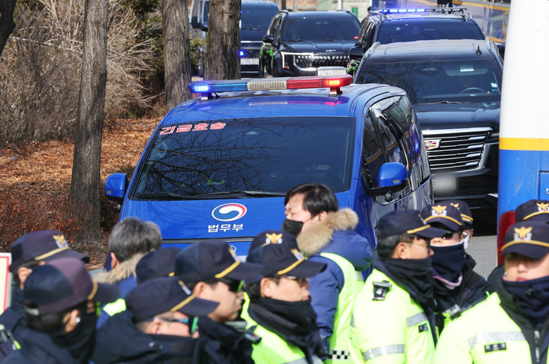 내란 우두머리 혐의로 체포된 윤석열 대통령이 탑승한 차량 행렬이 18일 경기도 의왕시 서울구치소에서 나와 구속 전 피의자심문(영장실질심사)이 열리는 서울서부지법으로 향하고 있다. 2025.1.18