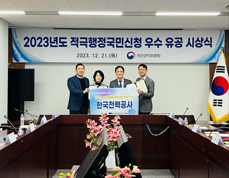 한국전력공사(사장 김동철, 상임감사위원 전영상)는 21일(목) 국민권익위원회에서 주최하는 ‘2023년도 적극행정국민신청 유공’ 시상식에서 ‘우수기관’ 및 ‘우수직원(감사실 심지은 차장)’ 2개 부문에서 국민권익위원장상을 수상하였다.