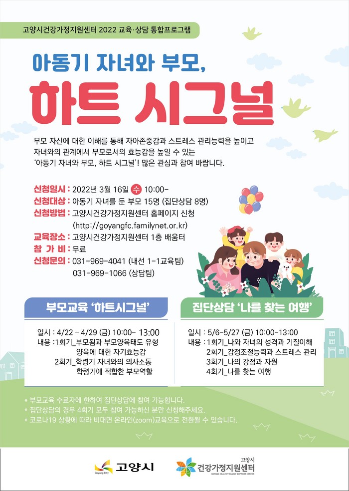 [부자동네타임즈 김인수기자] 고양시건강가정지원센터에서 아동기 부모를 대상으로 부모교육 ‘하트 시그널’ 및 집단상담 ‘나를 찾는 여행’을 진행한다.