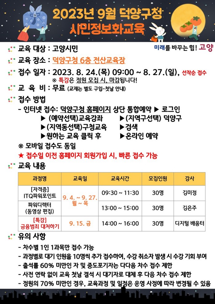 [부자동네타임즈 김인수기자] 고양특례시 덕양구는 고양시민을 대상으로 하는 디지털 금융범죄 예방 특강 및 제6차 시민정보화교육을 9월에 시행한다. 교육 접수는 오는 24일 오전 9시부터 가능하다.