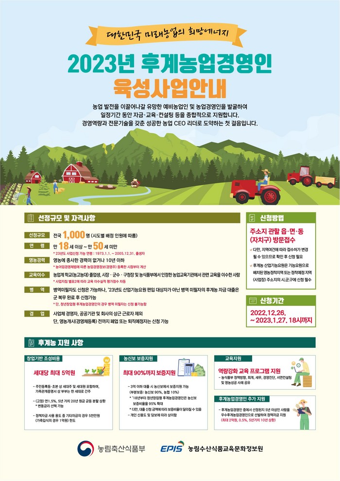 [부자동네타임즈 김인수기자] 고양특례시 일산서구청(구청장 정윤식)은 젊고 유능한 인재의 농업 분야 진출을 촉진하기 위하여 이달 27일까지 진행하는‘2023년 후계농업경영인 육성 사업’ 신청 독려에 나선다.