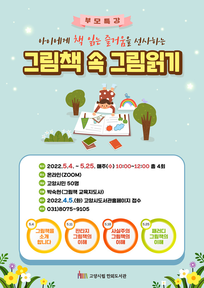교육은 5월 4일부터 25일 까지 매주 수요일 오전 10시~ 12시까지 진행되며 자녀의 그림책 교육에 관심이 있는 시민이라면 누구나 참여할 수 있다.