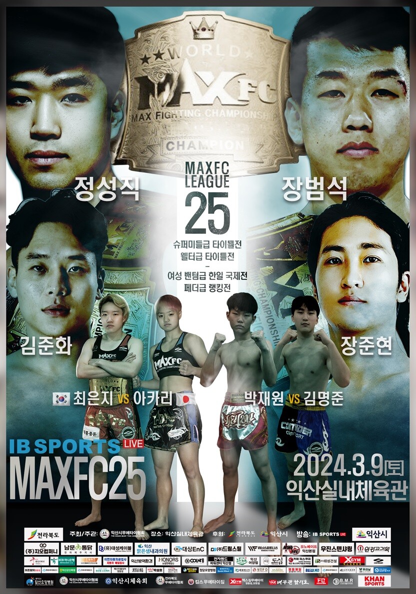 [부자동네타임즈 = 김인수 기자] 국내 최대 입식격투기 단체 MAX FC(대표 이용복)가 오는 3월 7일(토) 익산실내체육관에서 열리는 ‘MAXFC 25 IN 익산’ 대회의 전 경기를 확정하고 종합격투기 대회사 더블지FC와 합동이벤트를 개최한다고 발표했다.
