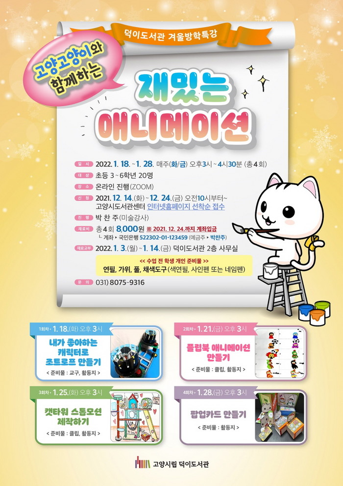 [부자동네타임즈 김인수기자] 고양시 덕이도서관이 겨울방학을 맞이해 내년 1월 18일부터 1월 28일까지 겨울방학 특강교실 ‘고양고양이와 함께 하는 재밌는 애니메이션’을 운영하다.
