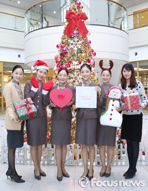 △ 아시아나항공 임직원들이 강서구 오쇠동 아시아나타운 본관에 설치된 크리스마스 트리 앞에서 크리스 마스 캐럴 앨범 자켓사진을 들고 기념촬영을 하고 있다. <사진제공=아시아나항공> |