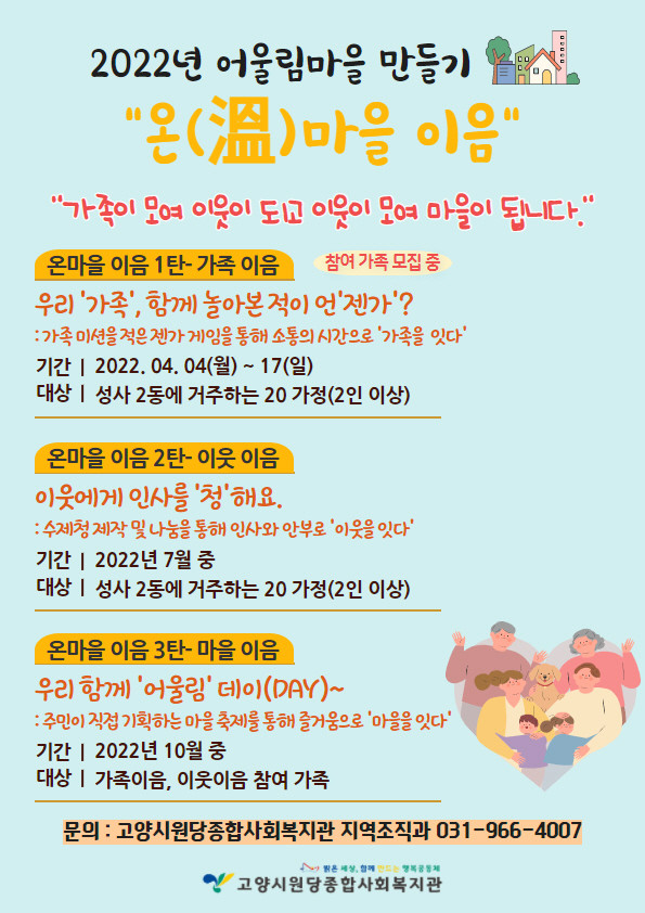 [부자동네타임즈 김인수기자] 고양시 원당종합사회복지관(관장 황의철)이 마을 만들기 사업 ‘온(溫)마을 이음’에 참여할 성사2동 거주 가구를 모집한다.