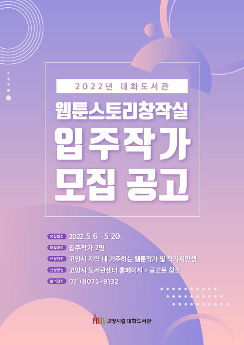 [부자동네타임즈 김인수기자] 고양시 대화도서관이 지역 내 웹툰(만화) 작가를 지원, 육성하여 양질의 콘텐츠를 제작하기 위하여 2022년 웹툰스토리창작실에 입주할 작가를 모집한다.