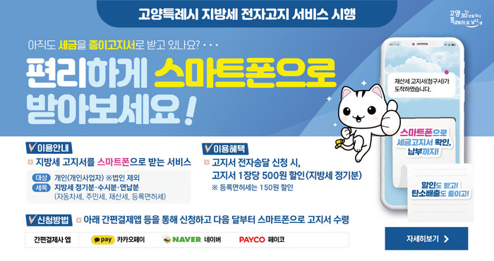 [부자동네타임즈 김인수기자] 고양시가 고지서를 받지 못 하거나 바쁜 일상 탓에 지방세 납부를 잊는 일을 예방하기 위해 지방세 전자송달 서비스를 시행하고 있다. 시는 세금 할인 혜택도 받을 수 있는 지방세 전자송달 서비스를 많은 시민이 이용하길 바란다고 전했다.