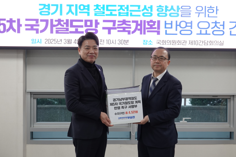 부승찬 국회의원(더불어민주당 용인시병)은 4일 국토교통부 고위 관계자를 만나 수지 주민 4,512명의 서명지를 전달하며 “경기남부 및 용인수지의 교통난 해소와 지역균형발전에 필수적인 경기남부광역철도는 제5차 국가철도망 구축계획에 반드시 반영해야 한다”라고 말했다.