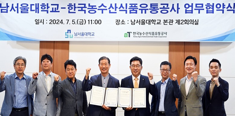 한국농수산식품유통공사(사장 김춘진)와 남서울대학교(총장 윤승용)는 5일 남서울대학교 본교에서 미래 인재 육성과 저탄소 식생활 확산을 위한 업무협약을 체결했다.