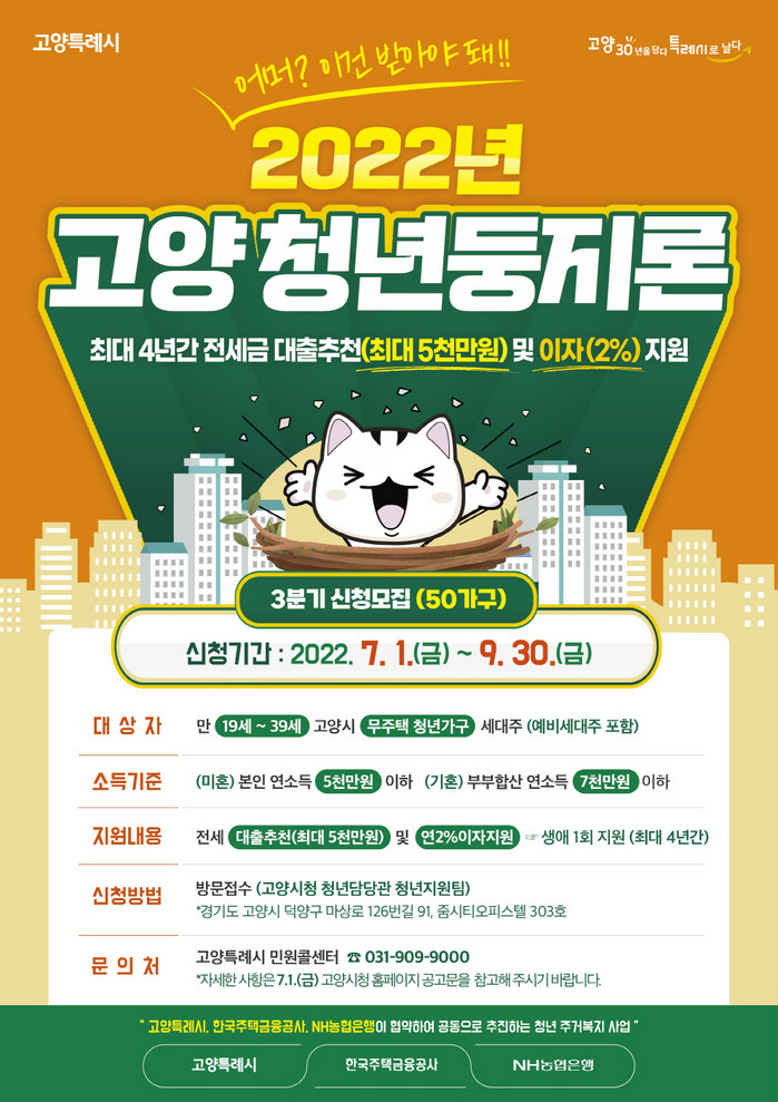 [부자동네타임즈 김인수기자] 고양시(시장 이동환)가 7월 1일부터 ‘고양 청년둥지론’ 사업의 3분기 지원가구(50가구)에 대한 신청자 모집을 진행한다.