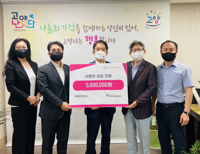 전달식에는 ㈜비긴어스 김정훈 대표와 고양시사회복지협의회 및 시 관계자가 함께했다. 전달받은 성금은 고양시사회복지협의회를 통하여 관내 저소득가정 및 취약계층에게 전달될 예정이다.