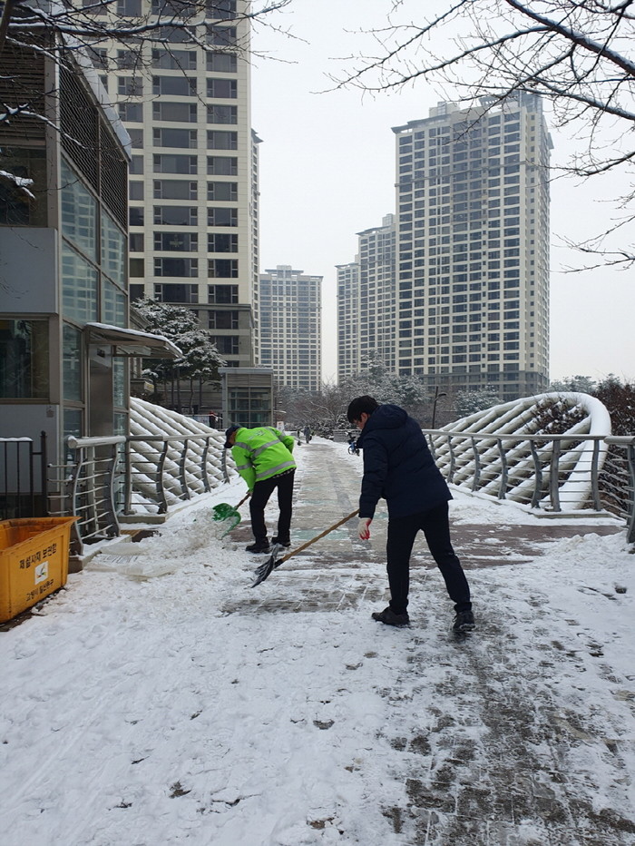 이날 동행정복지센터 직원들과 제설봉사단 회원들은 버스정류장 및 육교를 중심으로 제설작업을 실시했다.