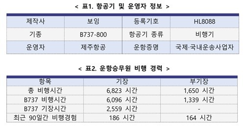 기장(45)은 총 비행시간이 6천823시간으로, 이 가운데 사고 기종으로 비행한 시간이 6천96시간(기장으로서 비행한 시간은 2천559시간)이었다. 사고 직전 90일간 비행시간은 186시간으로 조사됐다.
