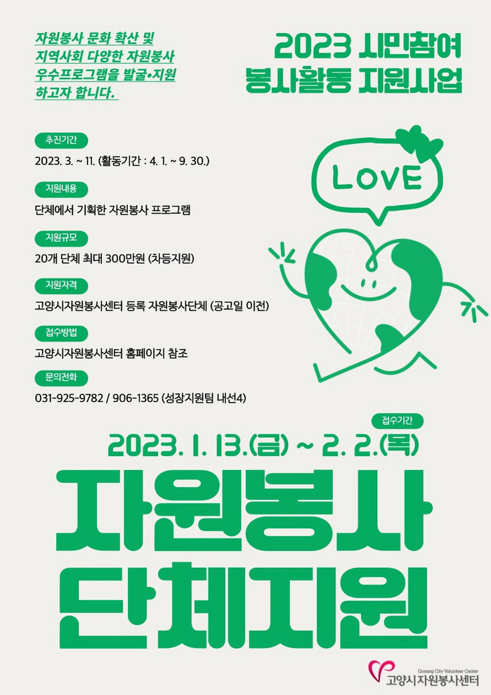 [부자동네타임즈 김인수기자] 고양시자원봉사센터는 ‘2023 시민참여 봉사활동 지원사업’에 참여할 자원봉사단체를 모집한다고 밝혔다. 시민참여 봉사활동 지원사업은 다양하고 참신한 자원봉사 프로그램을 발굴 ‧ 지원하여 자원봉사 시민참여 분위기를 확산시키기 위한 것이다.