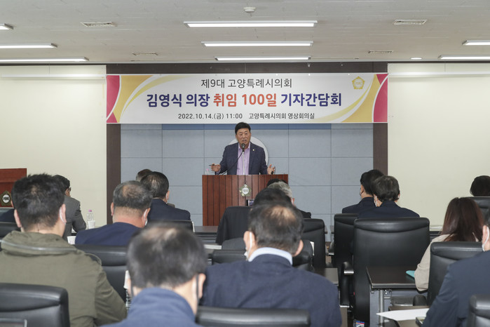 [부자동네타임즈 김인수기자] 제9대 고양특례의회 김영식의장이 취임한지 100일을 맞아 10월 14일(금) 11시 의회 영상회의실에서 기자간담회를 개최했다.
