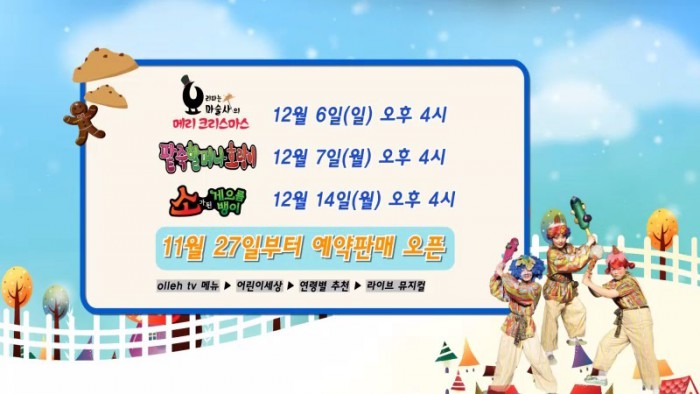 27일 KT에 따르면 올레tv는 ‘요리하는 마술사’를 크리스마스 버전으로 각색한 ‘요리하는 마술사의 메리 크리스마스’(12월6일 오후4시, 파주 프로방스 마술극장)와 전국 순회 중인 ‘팥죽 할머니와 호랑이’(12월 7일 오후 4시, 대전 조이마루 오즈아트홀), ‘소가 된 게으름뱅이’(12월14일 오후 4시, 대전 조이마루 오즈아트홀)를 실시간 중계한다.