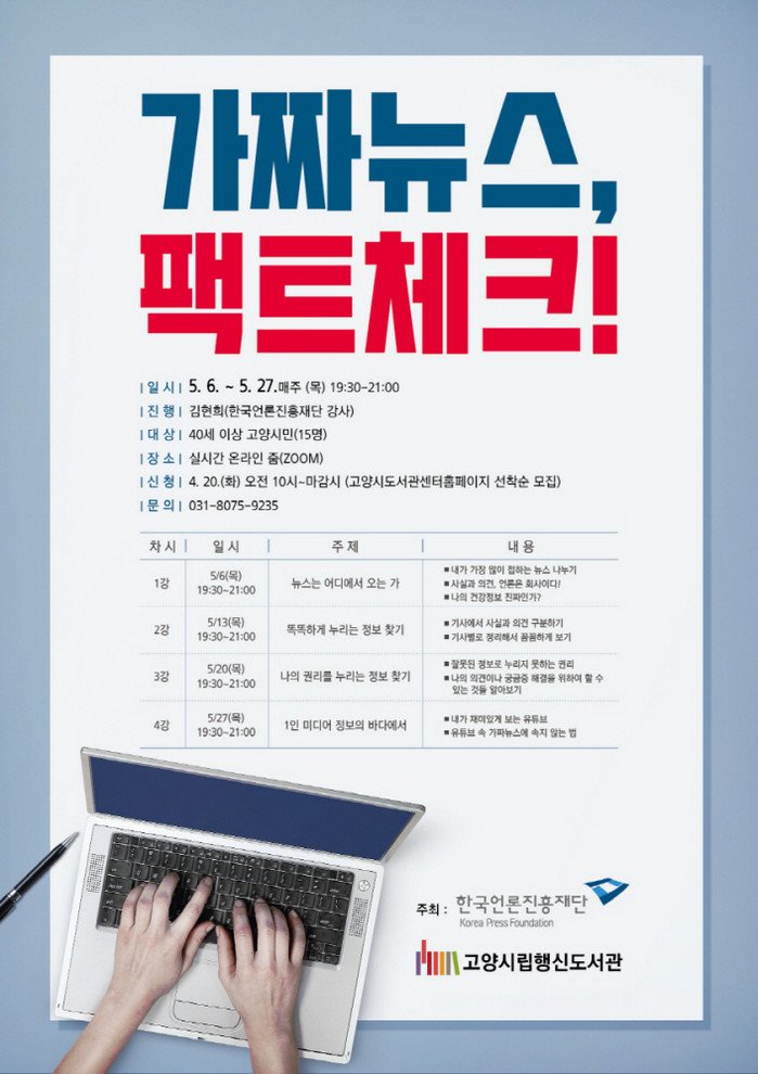 [부자동네타임즈 김인수기자] 고양시 행신도서관에서는 중장년층 시민들을 위해 5월 6일부터 정보리터러시 강좌‘가짜뉴스, 팩트체크’를 운영한다.