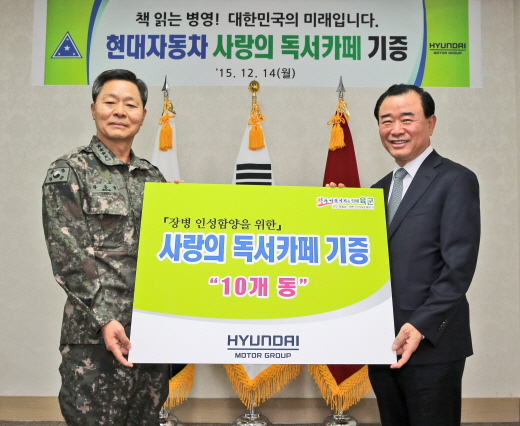 [부자동네타임즈 이채봉 기자] 현대자동차그룹이 지난 14일 용산 국방부 육군 서울 사무소에서 장준규 육군참모총장, 박광식 현대자동차 부사장 등이 참석한 가운데 ‘사랑의 독서카페’ 기증식을 열고 육군에 ‘사랑의 독서카페’ 10동과 도서 3000권을 기증했다.