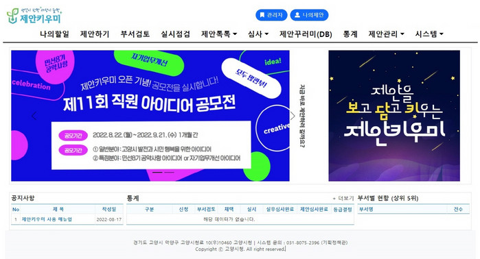 이에 고양시는 제안제도 개선과 효율화를 위해 제안 제도에 특화된 맞춤 플랫폼 개발에 착수했다. 고양시가 자체 개발한 ‘제안키우미’는 제안의 접수에서 부서의견 작성, 심사, 채택된 제안에 대한 실시 점검 등 사후관리까지 가능하다.