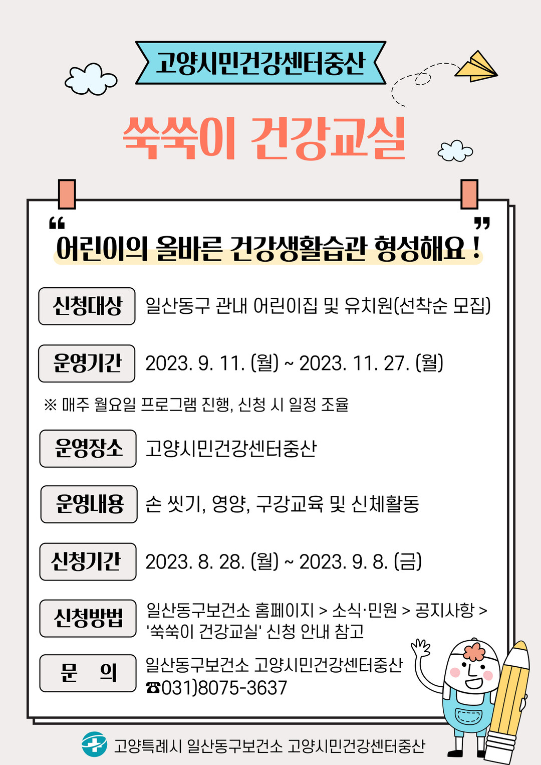 [부자동네타임즈 = 김인수 기자] 일산동구보건소에서 운영하는 고양시민건강센터 중산에서는 어린이의 올바른 건강생활습관 형성을 위한 「쑥쑥이 건강교실」의 참여기관을 모집한다. 건강교실은 9월 8일까지 신청이 가능하며, 9월 11일부터 운영을 시작한다.
