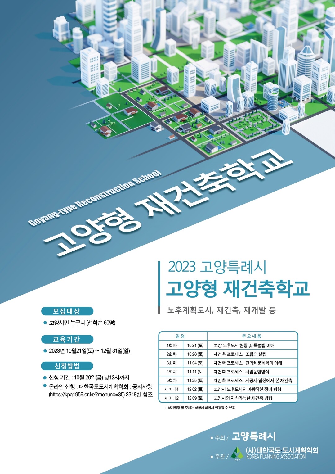 ‘고양형 재건축학교’는 10월 21일부터 5회에 걸쳐 운영될 예정이다. 참여를 희망하는 시민은 10월 5일부터 20일까지 고양시청 누리집이나 (사)대한국토도시계획학회 홈페이지에서 신청하면 된다.