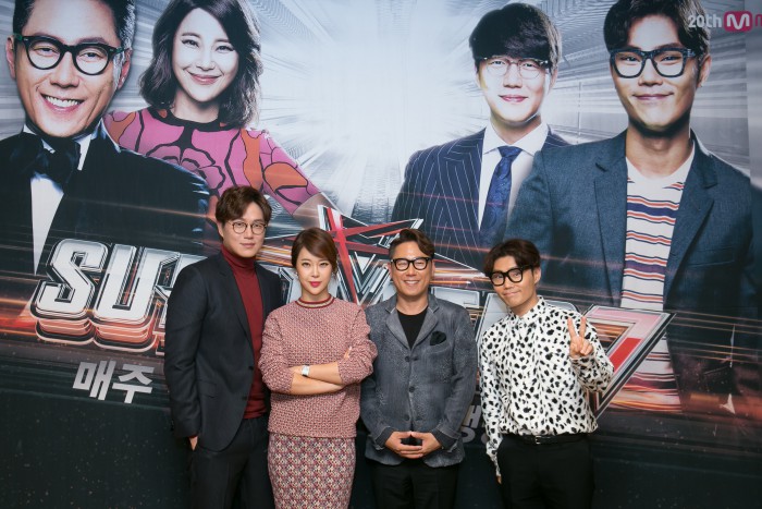 △ Mnet 오디션 프로그램 '슈퍼스타K7'의 심사위원을 맡은 성시경, 백지영, 윤종신, 김범수가 15일 서울 상암동 CJ E&M센터에서 열린 기자간담회에서 포즈를 취하고 있다.<사진제공=CJ E&M>