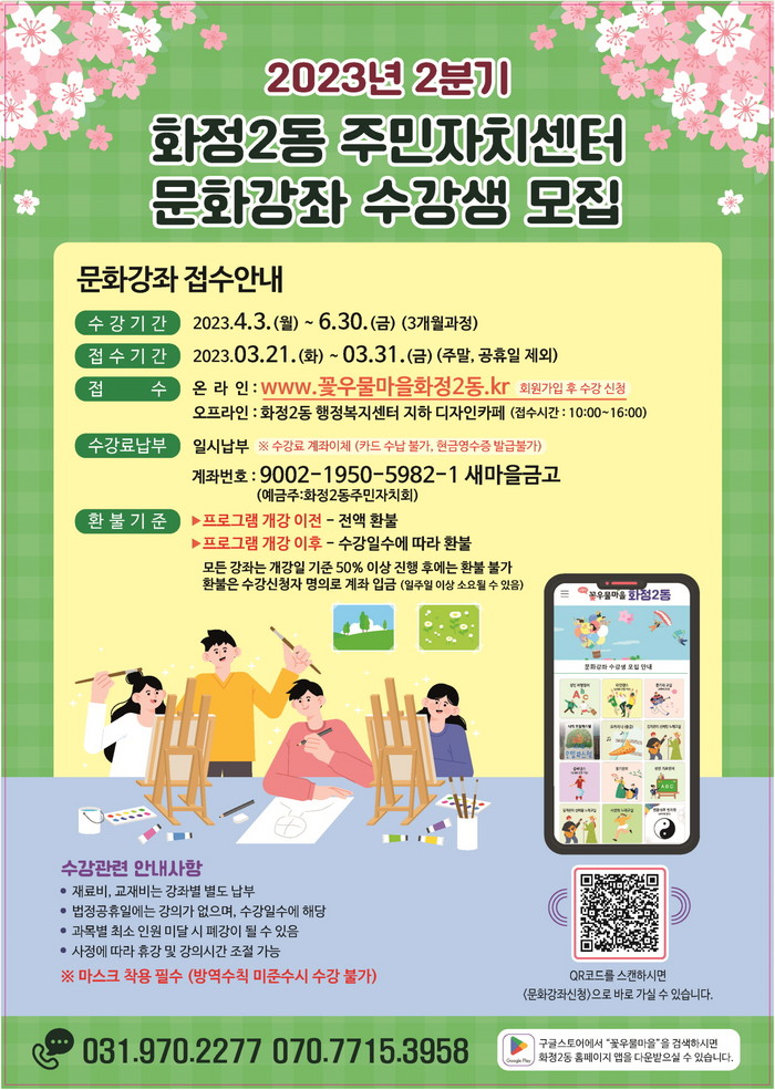 프로그램 및 일정, 접수방법 등 자세한 사항은 화정2동 주민자치회 홈페이지에서 확인할 수 있으며, 기타 문의는 디자인카페에서 가능하다.