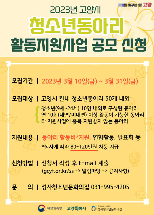 [부자동네타임즈 김인수기자] 고양시청소년재단(이사장 이동환) 성사청소년문화의집은 오는 31일까지 고양시의 건강하고 행복한 청소년 문화 조성을 위해 ‘2023 고양시 청소년동아리 활동 지원사업’ 참여 동아리를 모집한다.