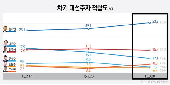 “김무성ㆍ김문수ㆍ문재인ㆍ박원순ㆍ안철수ㆍ오세훈(성명순) 여섯 사람 중에서 차기 대통령으로 가장 적합한 사람은 누구라고 생각하느냐”는 질문에 문재인 대표가 32.5%의 지지를 얻어 16.8%의 김무성 새누리당 대표와 12.1%를 얻은 박원순 서울시장을 각각 15.7%p, 20.4%p 앞서며 격차를 더 벌렸다. 뒤를 이어 오세훈 전 서울시장 8.8%, 안철수 의원 7.2%, 김문수 보수혁신위원장 6.8%순으로 나타났다(무응답 : 15.8%).